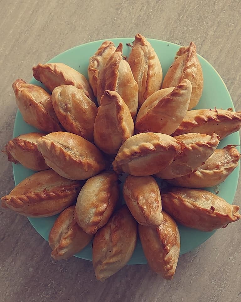 - Į tešlos vidurį dėkite kelis šaukštus įdaro ir pirštais užspauskite kraštus, kad susiformuotų tradicinė kibino forma su banguotu viršumi.