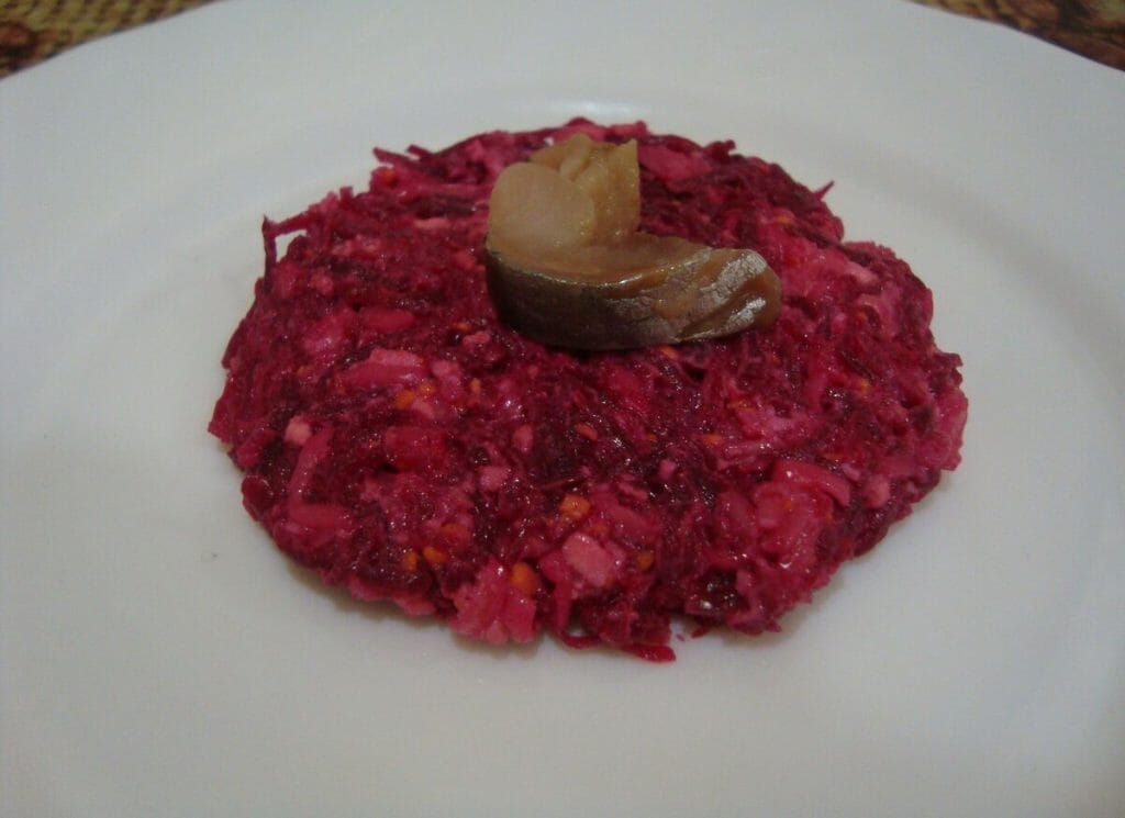 Imu po pilną valgomąjį šaukštą burokėlių masės ir formuoju iš jos paplotėlius. Į kiekvieno paplotėlio vidų dedu gabalėlį silkės.