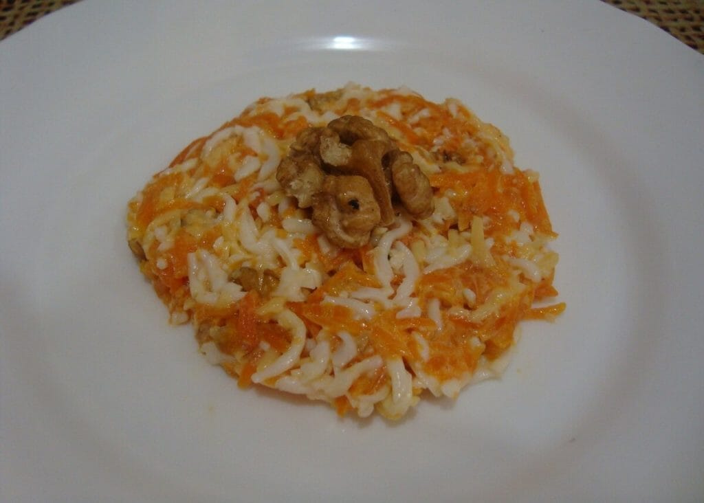 Morkas, sūrį, baltymus sutarkuoju vidutine trintuve. Graikinius riešutus smulkiai supjaustau. Česnaką išspaudžiu. Dedu šaukštą majonezo ir viską permaišau.