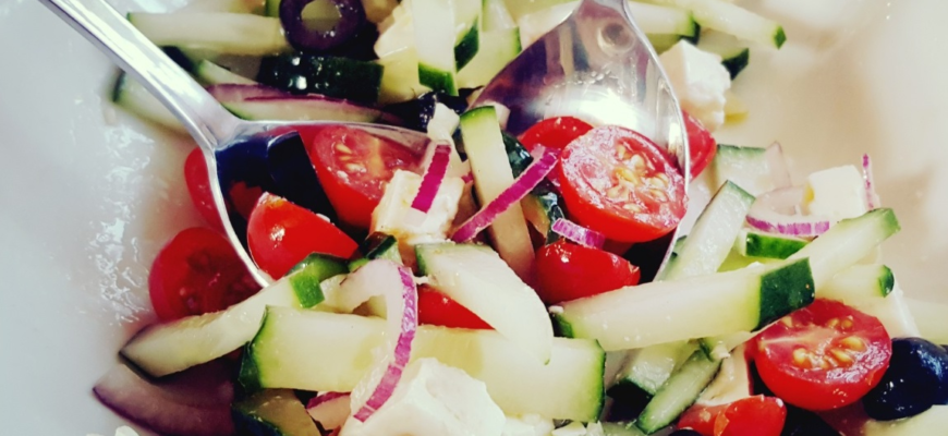 Graikiškos salotos su raudonaisiais svogūnais ir feta