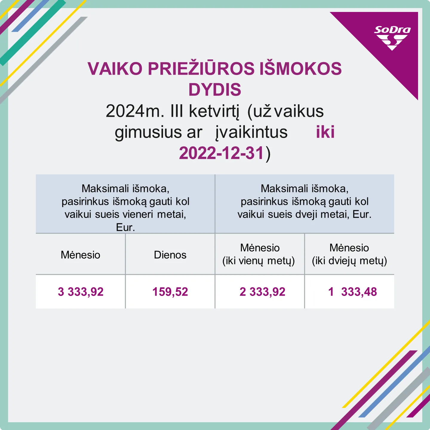 Maksimalių vaiko priežiūros išmokų dydžiai skirsis ne tik priklausomai nuo jas gaunančių žmonių pajamų, bet ir nuo to, ar prižiūrimi vaikai gimė iki 2022 metų gruodžio 31 d., ar 2023 metų sausio 1 d. ir vėliau, kadangi nuo 2023 metų sausio keitėsi vaiko priežiūros išmokų mokėjimo tvarka ir dydžiai.