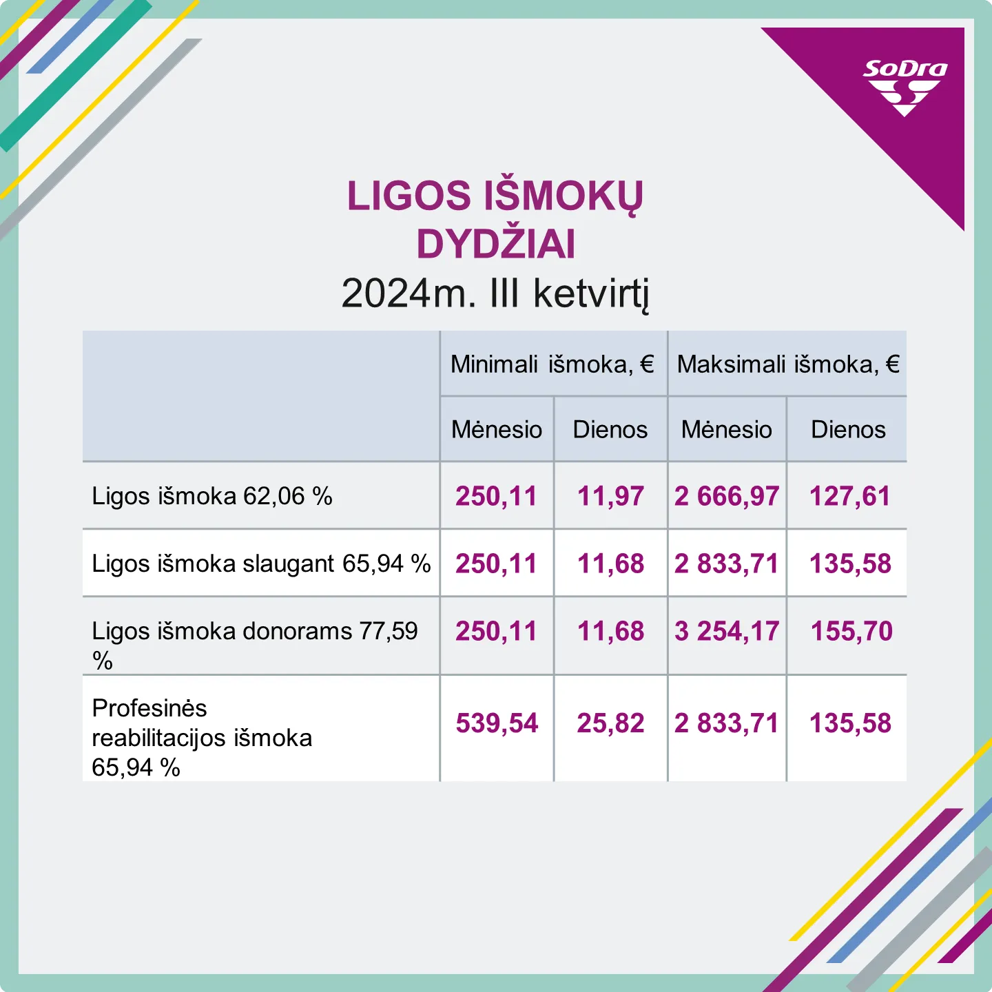 Ligos išmoka per mėnesį negali būti mažesnė negu 11,64 procento šalies VDU, galiojusio užpraeitą ketvirtį iki laikinojo nedarbingumo nustatymo dienos. Taigi, nuo liepos pradžios iki rugsėjo pabaigos mažiausia ligos išmoka negalės būti mažesnė nei 250,11 euro per mėnesį (buvo 244,13 euro) arba 11,97 euro per dieną.