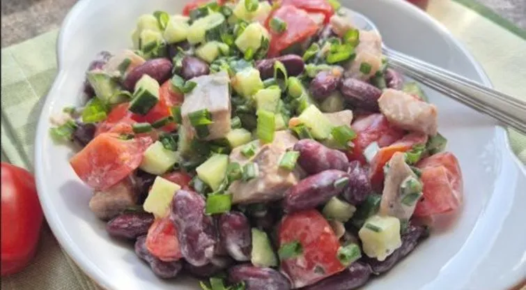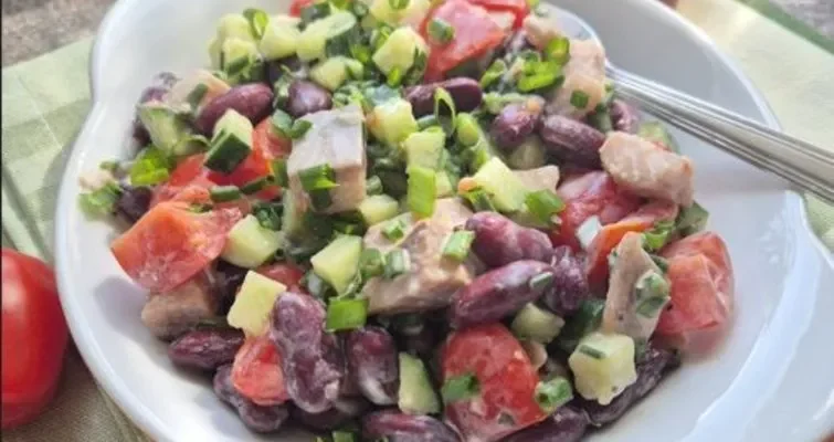 Silkę, agurkus ir pomidorus supjaustome kubeliais, svogūnų laiškus pasmulkiname. Gardiname druska, pipirais. Maišome su jogurtu. Skanaujame.