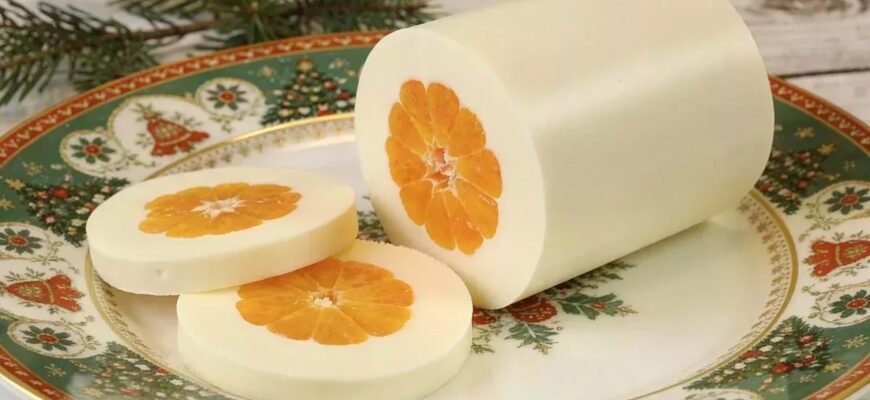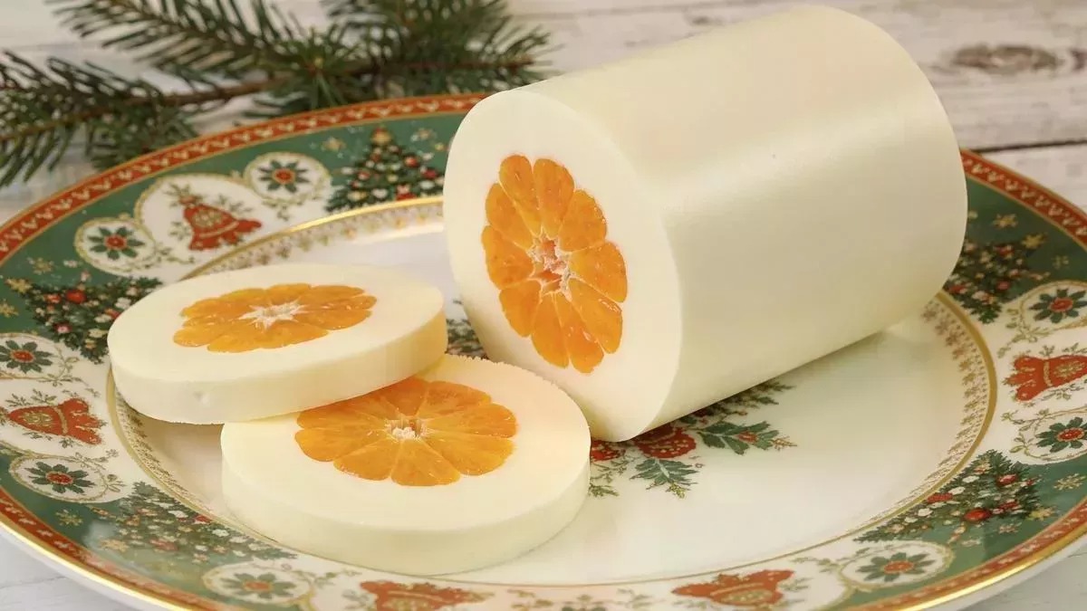 „Mandarinai sniege“ – tai švelni grietinės želė, įdaryta kvapniais vaisiais. Šiam desertui pagaminti reikės plastikinio butelio ir medinių pagaliukų.