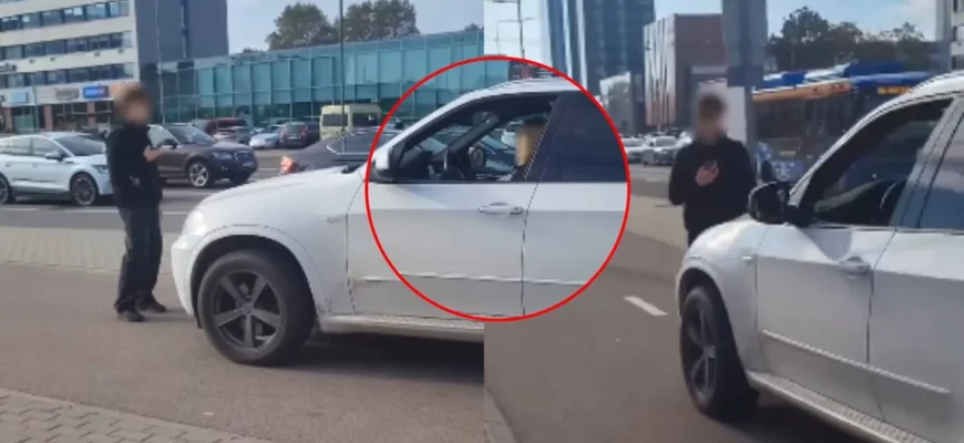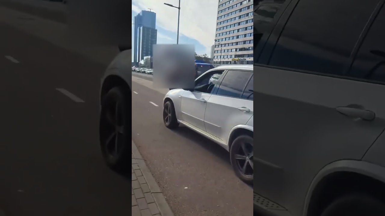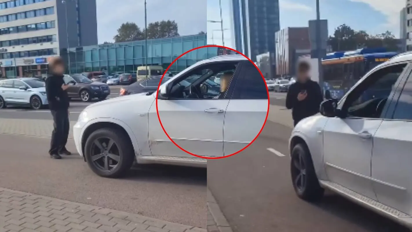 Filmuotoje medžiagoje matyti automobilis „BMW X5“, kuriam kelią pastojęs jaunuolis. To priežastis – BMW vairuotoja sumanė važiuoti dviračių ir pėsčiųjų taku.