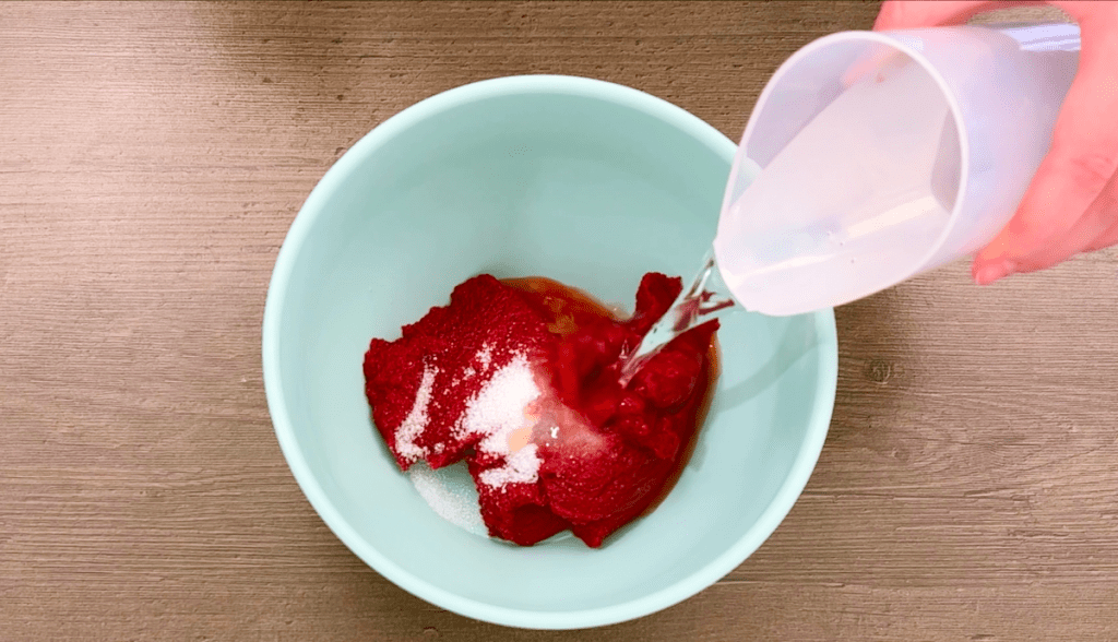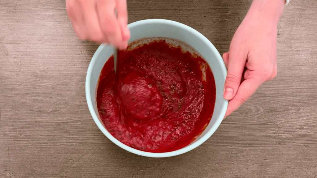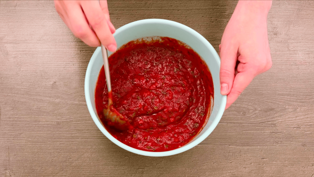 Padažo paruošimui imu 200 g pomidorų pastos ir dedu ją į tinkamą dubenį. Čia svarbiausia kokybiška pomidorų pasta! Reikia rinktis kokybišką pastą be priedų.
