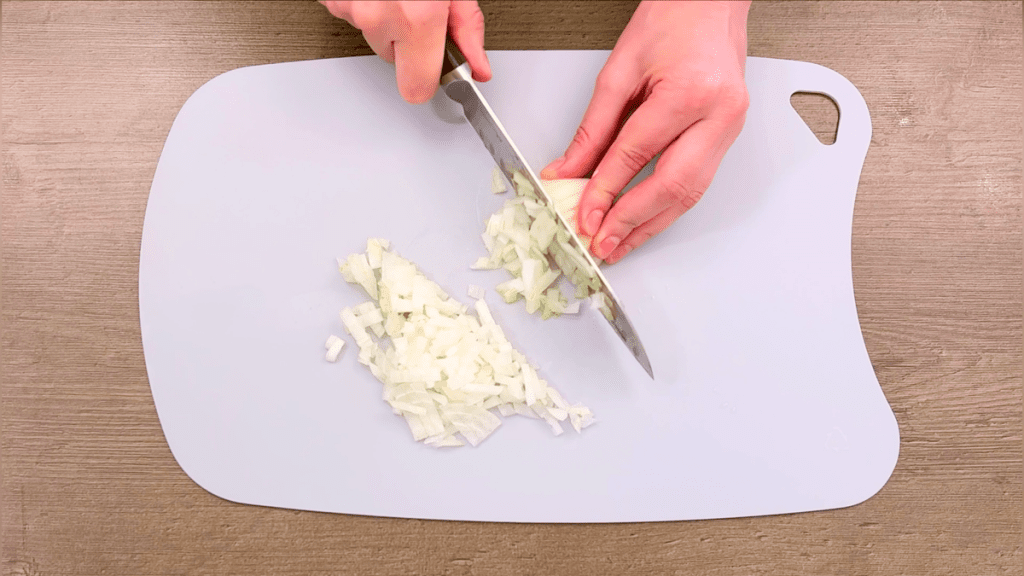 Šis ingredientas – vienas nedidelis svogūnas. Supjaustau jį labai smulkiai ir dedu į padažą.
