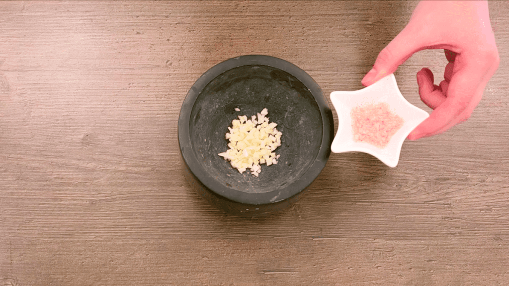 Beriu į česnaką 1 arbatinį šaukštelį druskos ir kruopščiai sutrinu druską su česnaku, taip padažas gaunasi kelis kartus aromatingesnis. Jei nėra grūstuvės, česnaką su druska galima sutrinti peiliu ant pjaustymo lentelės.