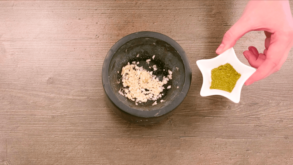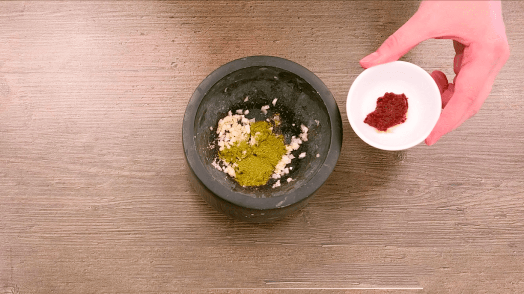 Paskui į grūstuvę beriu 1 arbatinį šaukštelį adžikos arba galima rinktis įprastus aštriuosius raudonuosius pipirus. Ir žinoma, šį ingredientą reikia varijuoti pagal savo skonį. Galima dėti daugiau, o galima ir išvis nedėti. Skonio reikalas.