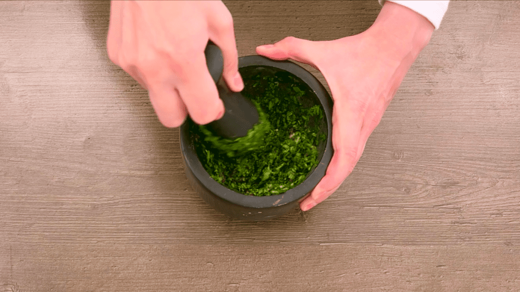Toliau aš imu 2 pundelius šviežios kalendros, smulkiai ją supjaustau ir dedu į grūstuvę. Ir dar kartą viską kruopščiai sutrinu.
