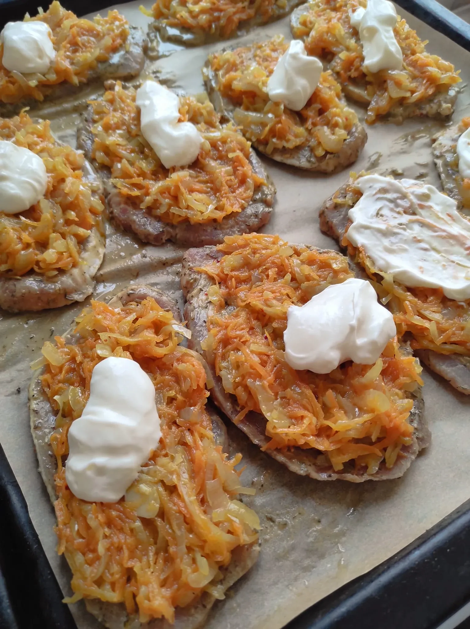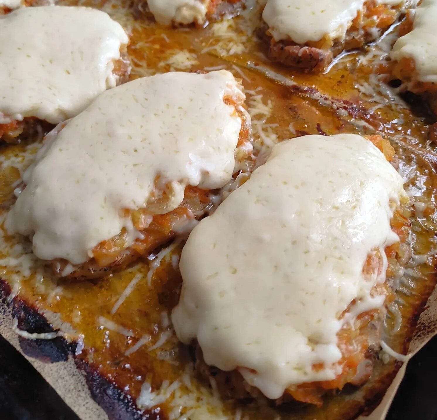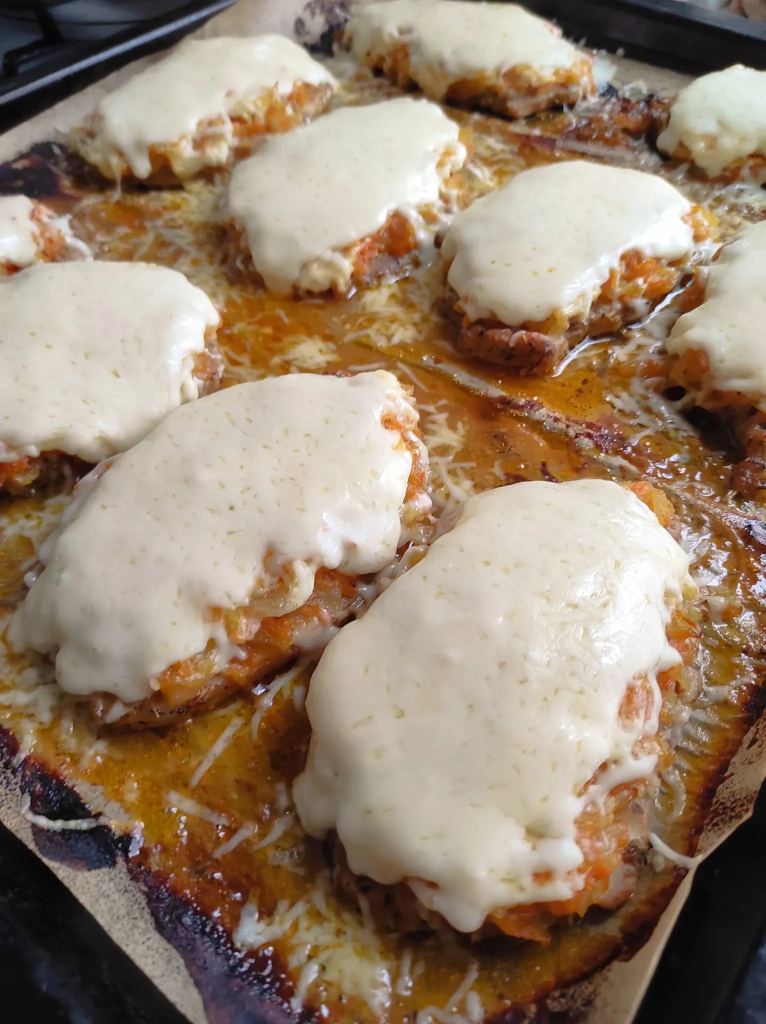 - Praėjus laikui, kepsnius ištraukiame bei apibarstome sūriu. Dedame dar į orkaitę, kol išsilydo sūris. Skanaujame!