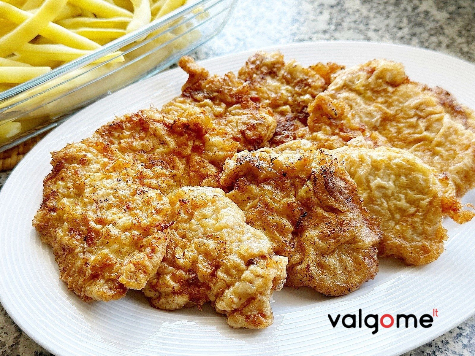 - Tada mėsą apvoliok miltuose, kiaušinio plakinyje ir avižiniuose dribsniuose.