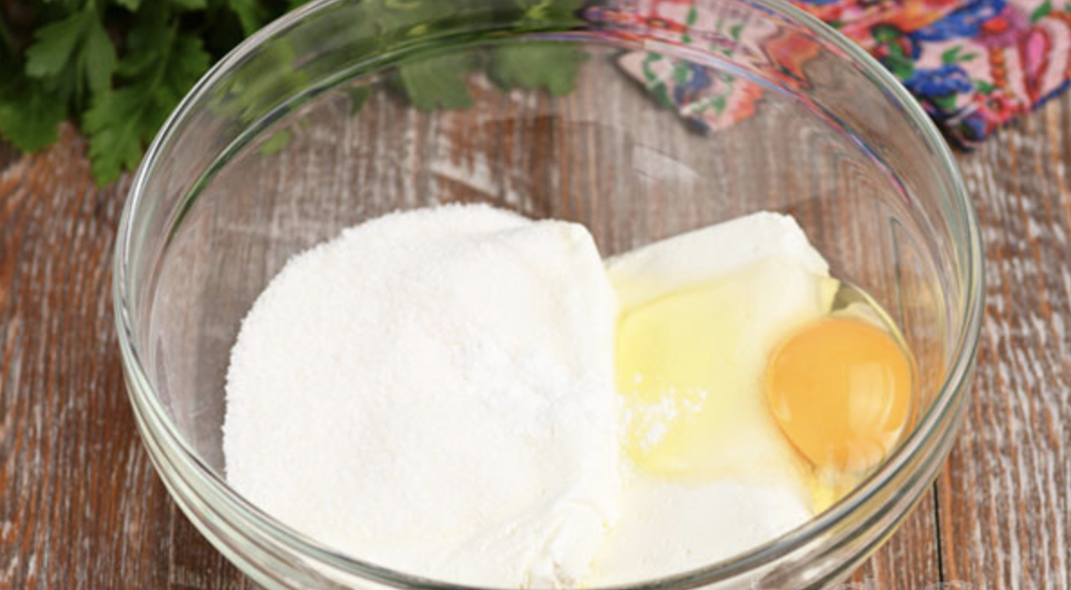 Įdaras. Į dubenį dedame 2 pakelius varškės (9% arba 5%), dedame 1 kiaušinį, vanilino (1g), cukraus (4 valgomuosius šaukštus).