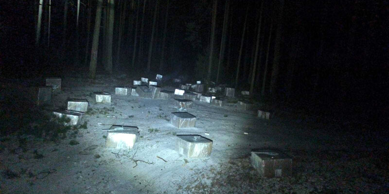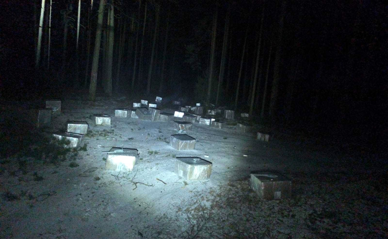 Kapčiamiesčio pasieniečiai miške netoli valstybės sienos su Baltarusija aptiko 50 tūkst. pakelių (100 dėžių) baltarusiškų cigarečių, kurių vertė – kone 260 tūkst. eurų.