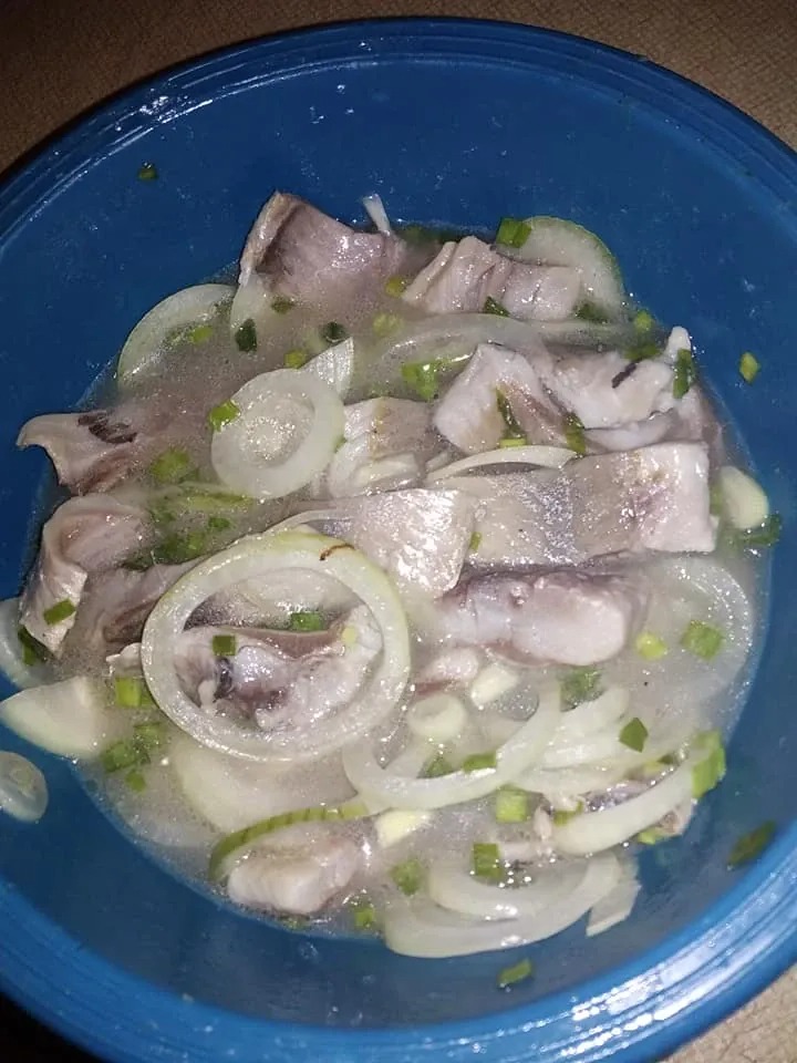 - Į dubenį sudėtos silkės riekelės bei svogūnų žiedai, o ant viršaus užpilta iš anksto sumaišyta acto, vandens ir cukraus marinato masė.