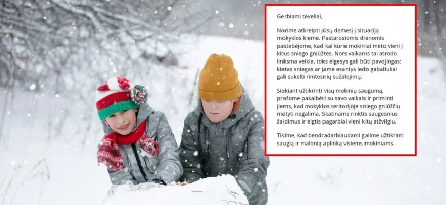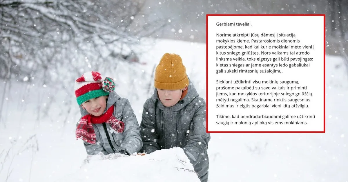 Norime atkreipti Jūsų dėmesį į situaciją mokyklos kieme. Pastarosiomis dienomis pastebėjome, kad kai kurie mokiniai mėto vieni į kitus sniego gniūžtes. Nors vaikams tai atrodo linksma veikla, toks elgesys gali būti pavojingas: kietas sniegas ar jame esantys ledo gabaliukai gali sukelti rimtesnių sužalojimų.