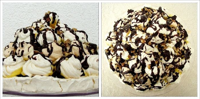 - Morengus pamirkyti kreme ir sudėti aplink šokoladinį biskvitą. Likusius morengus taip pat pamirkyti kreme ir sudėti ant torto piramidės forma. Kiekvieną morengo sluoksnį sulaistyti šokoladiniu glajumi ir apibarstyti likusiais (50 g) smulkintais graikiškais riešutais. Sudėjus visus morengus, viršų taip pat sulaistyti šokoladiniu glajumi ir apibarstyti smulkintais graikiškais riešutais.