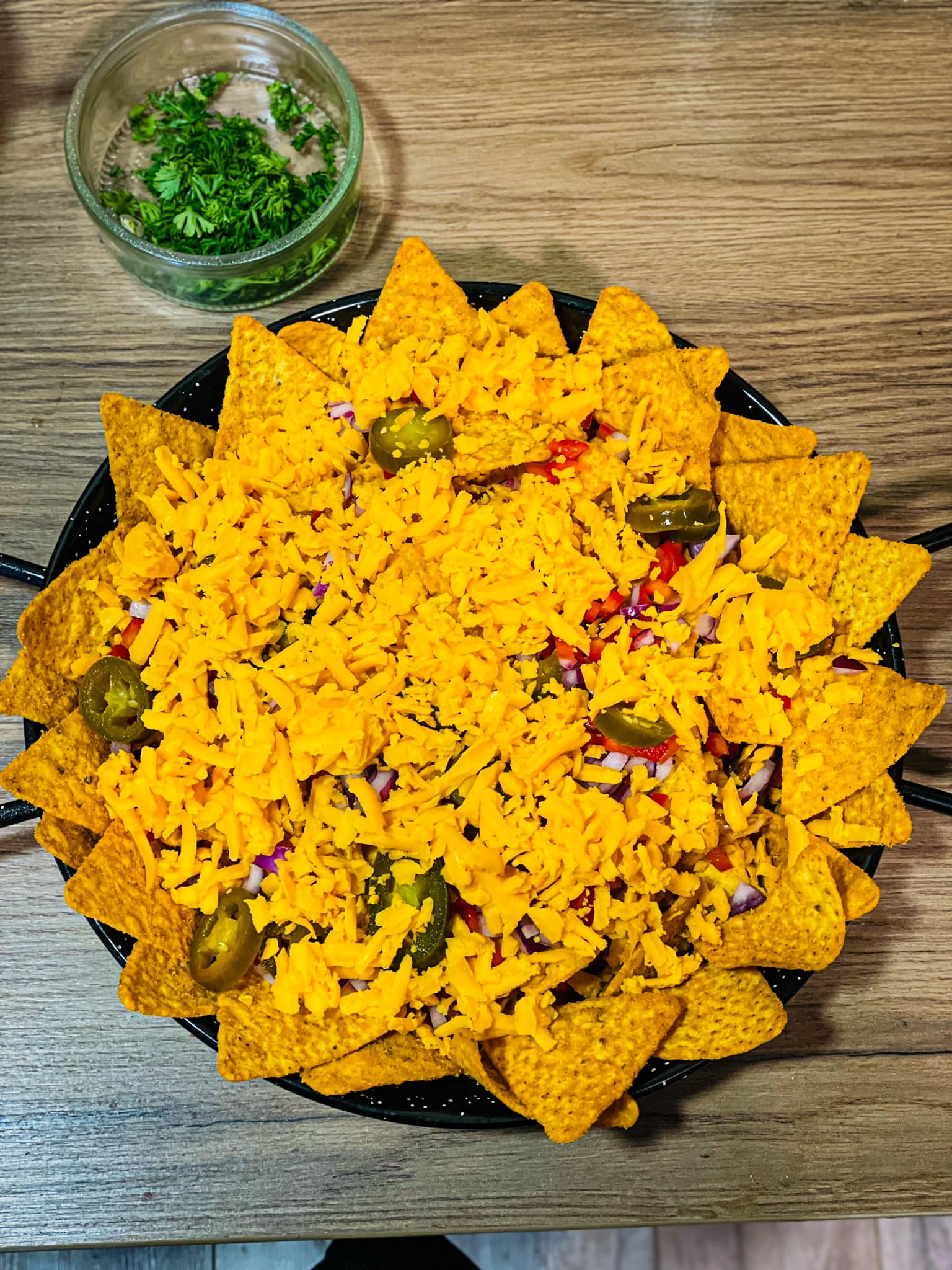 - Ant kepimo skardos paskleidėte kepimo popierių ir tolygiai išdėliojote nachos traškučius. Ant viršaus paskirstėte keptą vištieną, svogūnus, paprikas ir jalapenus. Užbėrėte gausiai tarkuoto čederio sūrio.