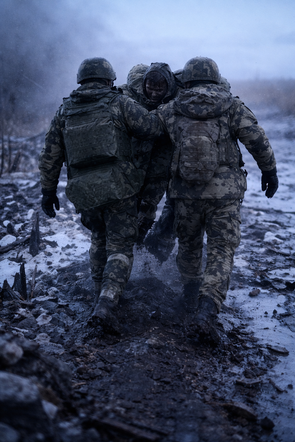 Ši maža rusų karių grupė džiaugiasi, kad niekas nežuvo. Per purvynus jie klampoja atgal – jie traukiasi. Tiesa, rusas optimistiškai prideda – „kol kas“. Ant pečių jie neša savo vadą, kuris grįžti jau tikrai nenorės.