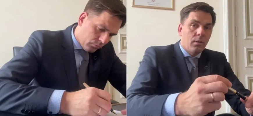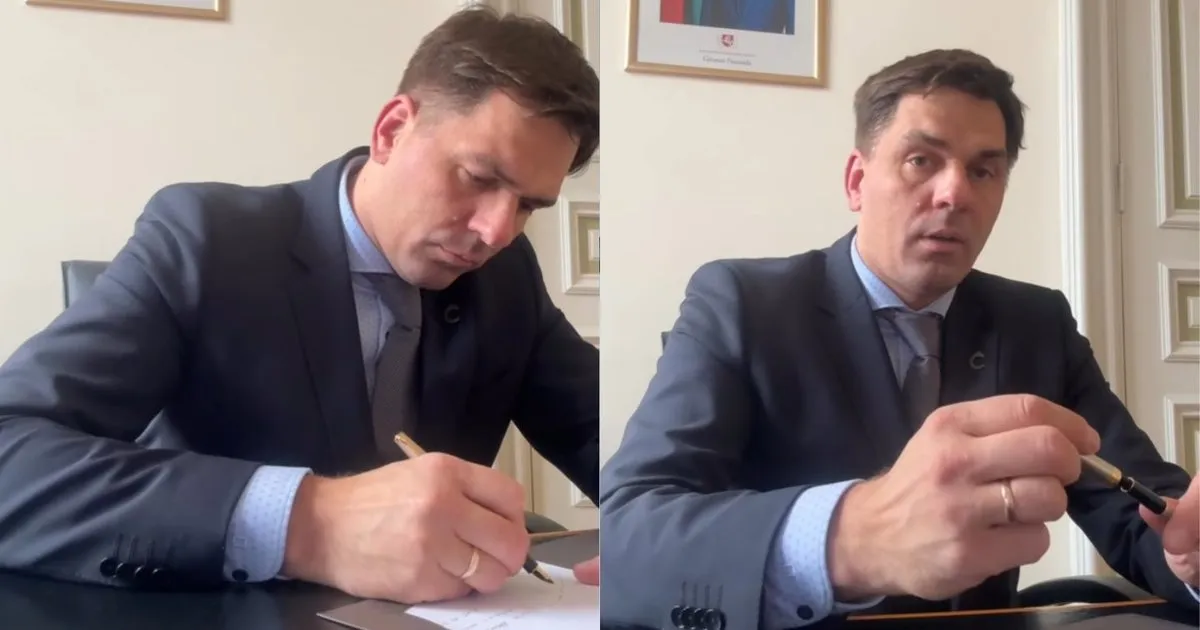 Penktadienio popietę I. Adomavičius savo „Facebook“ paskyroje pasidalino vaizdo įrašu, kuriame pats I. Adomavičius sėdi už ministro stalo bei rašo palinkėjimą būsimam kultūros ministrui.