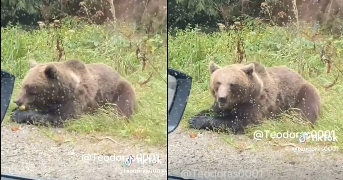 Vyriškis, sustojęs prie gyvūno, pro automobilio langą išmetė jai obuolį, kurį meškutė iškart pradėjo valgyti.