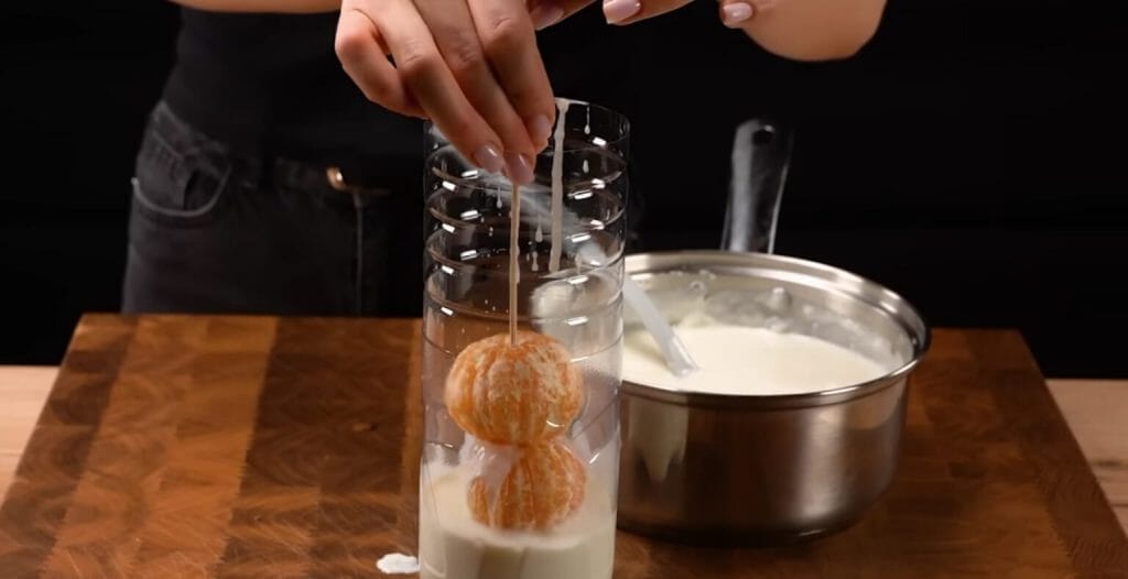 Į formą įdėkite nuluptus mandarinus, užmautus ant medinių pagaliukų. Užpilkite mandarinais likusia pieno mase.