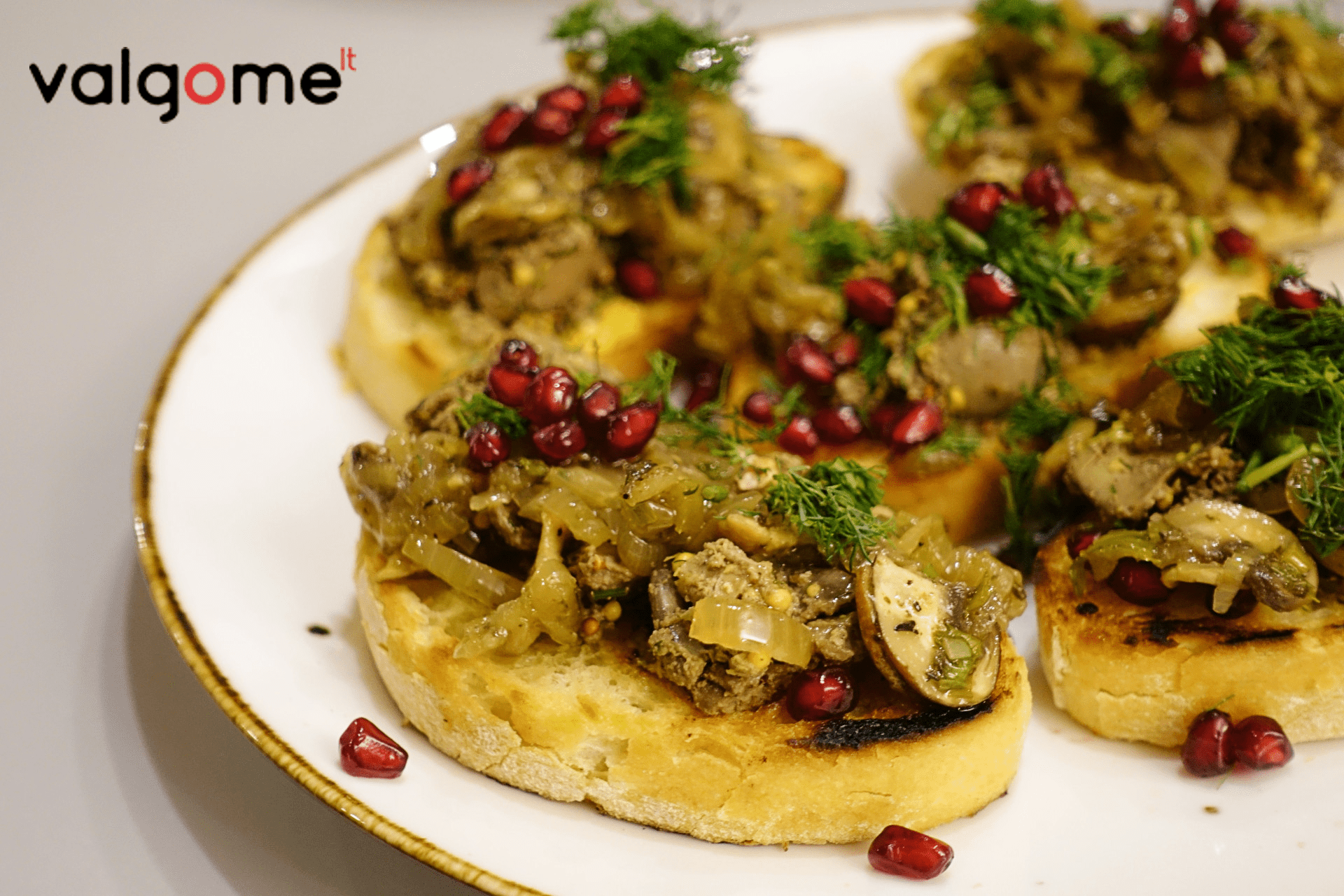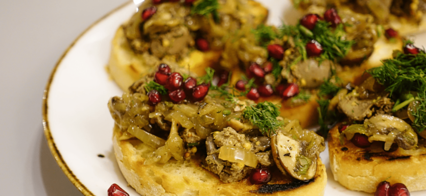 • Vištienos kepenėles dėk ant paskrudintos ciabatos arba naminės duonos riekės, ant viršaus dėk svogūnų-pievagrybių pagardą ir pabarstyk granatų sėklų. Skanauk!