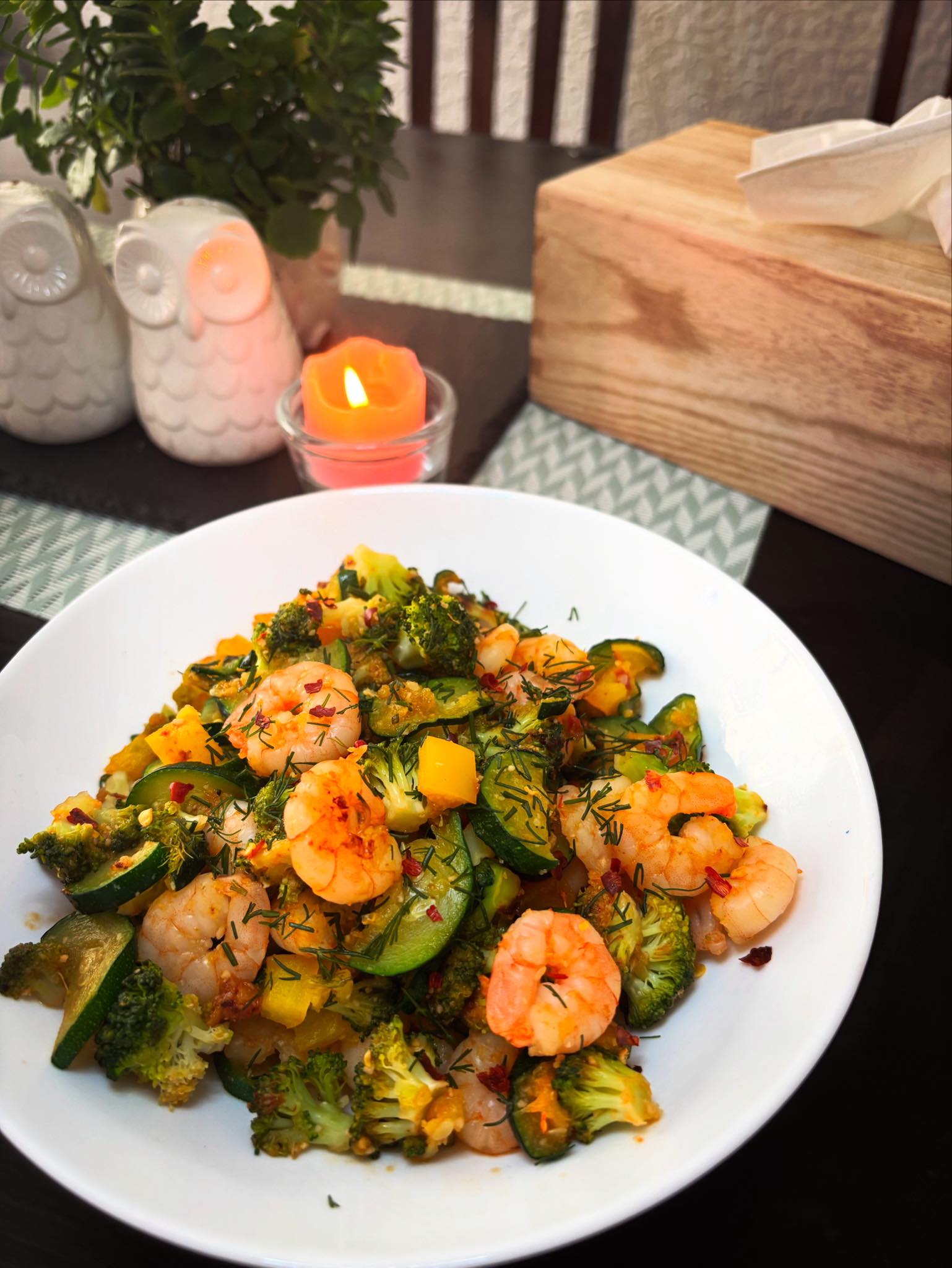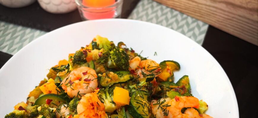 Keptos krevetės su česnaku, alyvuogių aliejumi ir daržovėmis – tai lengvas, sveikas ir ypač greitai paruošiamas patiekalas, puikiai tinkantis vakarienei po ilgos darbo dienos. Jame dera Viduržemio jūros regiono skoniai, kvapai ir spalvos – sultingos krevetės, švieži brokoliai, saldi paprika, švelni cukinija ir aromatingi prieskoniai sukuria harmoningą ir sotų, bet neapsunkinantį patiekalą. Šis receptas patiks tiek jūros gėrybių gerbėjams, tiek ieškantiems idėjų sveikesniam maisto racionui. Be to, tai patiekalas, kurį galima lengvai pritaikyti pagal turimus ingredientus ir skonio pageidavimus.