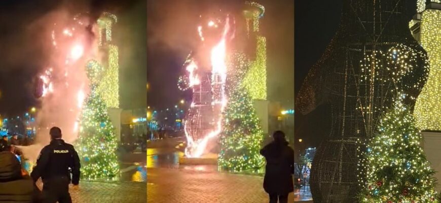 Socialiniuose tinkluose pasirodė vaizdo įrašas, kaip liepsnoja didžiulė kalėdinė dekoracija – eglę apgobusi meška.