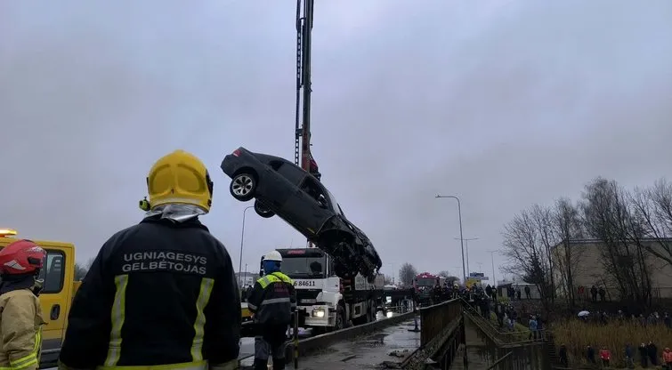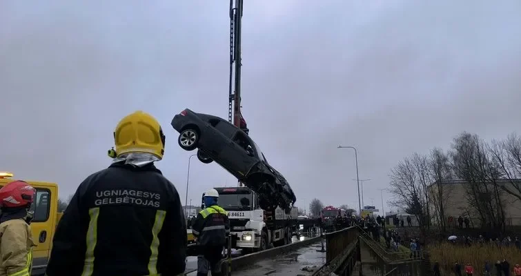 Naujienų portalo tv3.lt žiniomis, gelbėtojams pavyko įvykdyti vieną iš planų – užkabinus trosą ant BMW, kranas automobilį iškėlė į viršų.