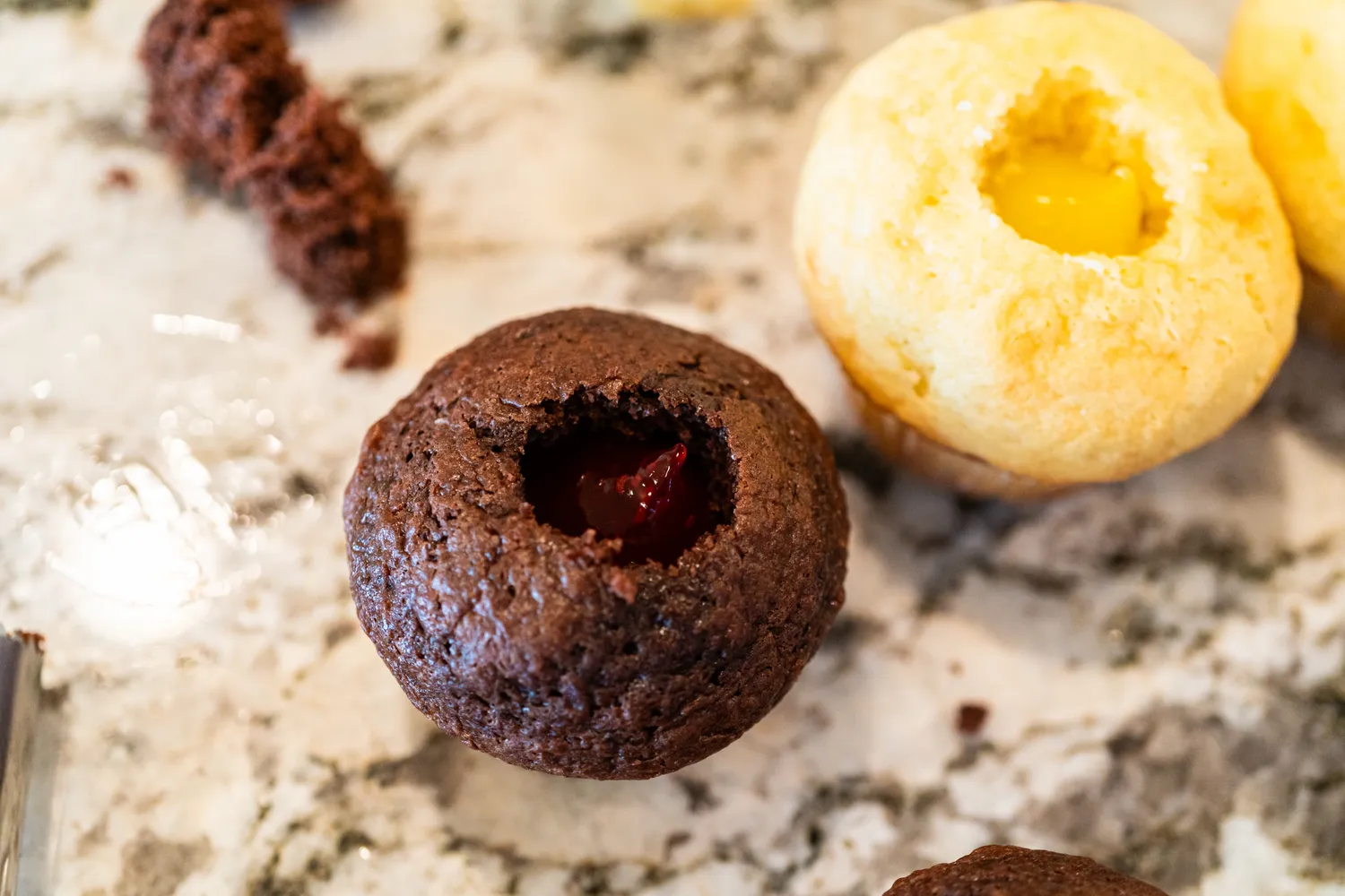 Triukas, dėl kurio šie keksiukai visada pavyksta, yra senas kepėjų fokusas – stiklinė. Ji padeda tolygiai prispausti tešlą, suformuoti gražius dubenėlius ir užtikrinti, kad šokoladinis centras liks ten, kur jam ir priklauso: viduryje.