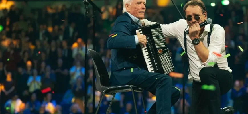 J. Mikutavičius taip pat visiems priminė bene populiariausią Jungėnų kaimo kapelos kūrinį „Vėl gegužio žiedai“, kurį jam akomponuojant akordeonu, dainavo visa arena.