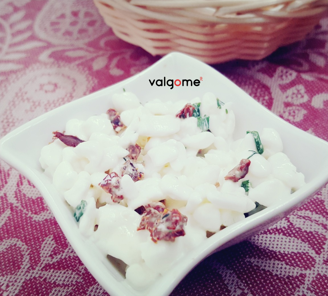 - Sumaišome visus ingredientus – grūdėtą varškę, česnaką, pomidorus, krapus ir svogūnų laiškus – didesniame dubenyje, kol viskas tampa tolygiai sumaišyta.
