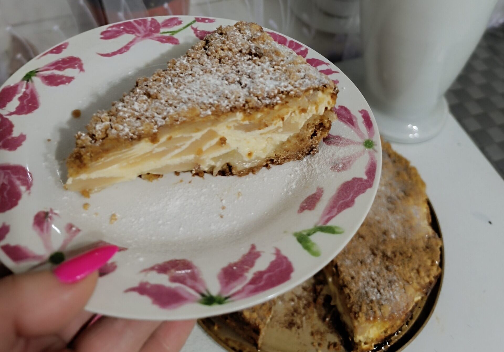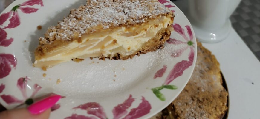 Varškės ir obuolių pyragas su sviestinės tešlos pagrindu – tai puikus desertas, kuriame susilieja švelnios varškės, sultingų obuolių ir trapios sviestinės tešlos skoniai. Pyrago pagrindas yra pagamintas iš sviestinės tešlos, kuri kepant tampa malonia auksinė. Ant šio trapaus pagrindo dedamas sluoksnis kreminės varškės, suteikiantis pyragui švelnumo ir lengvumo. Viršuje – sultingų, saldžiarūgščių obuolių sluoksnis, kuris kepant karamelizuojasi ir praturtina pyragą natūralia gaiva. Ir viskas uždengta dar sluoksniu sviestinių trupinukų, kurie kepant tampa lengvai traškūs. Šis desertas išsiskiria savo tekstūromis ir skoniais: traški tešla, švelni varškė ir minkšti, aromatingi obuoliai.